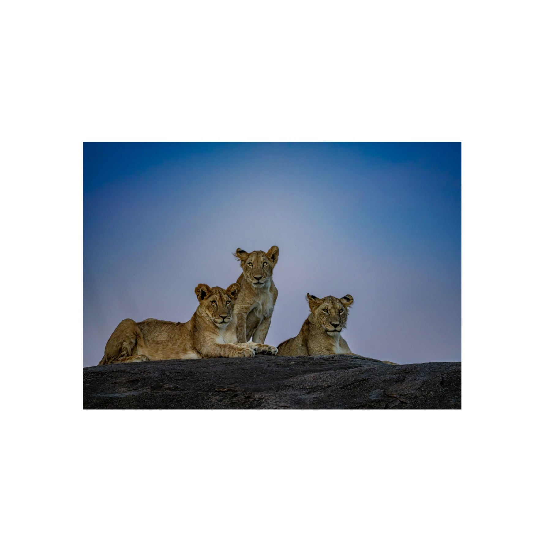 As daylight recedes, three young lions awaken together, their attention turning outward as night approaches. Photographed during the final moments of sunset, this image captures a shift in energy, from rest to readiness. My work centers on these understated transitions that define life in wild places.
